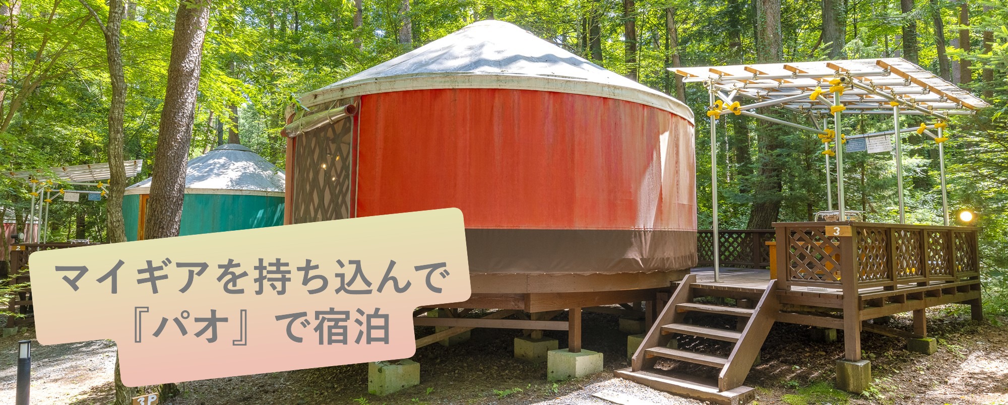 遊牧民が住む組み立て式住居「パオ」。設備はシンプルでリーズナブルな宿泊棟。お気に入りのキャンプ道具をお持ち込みください。