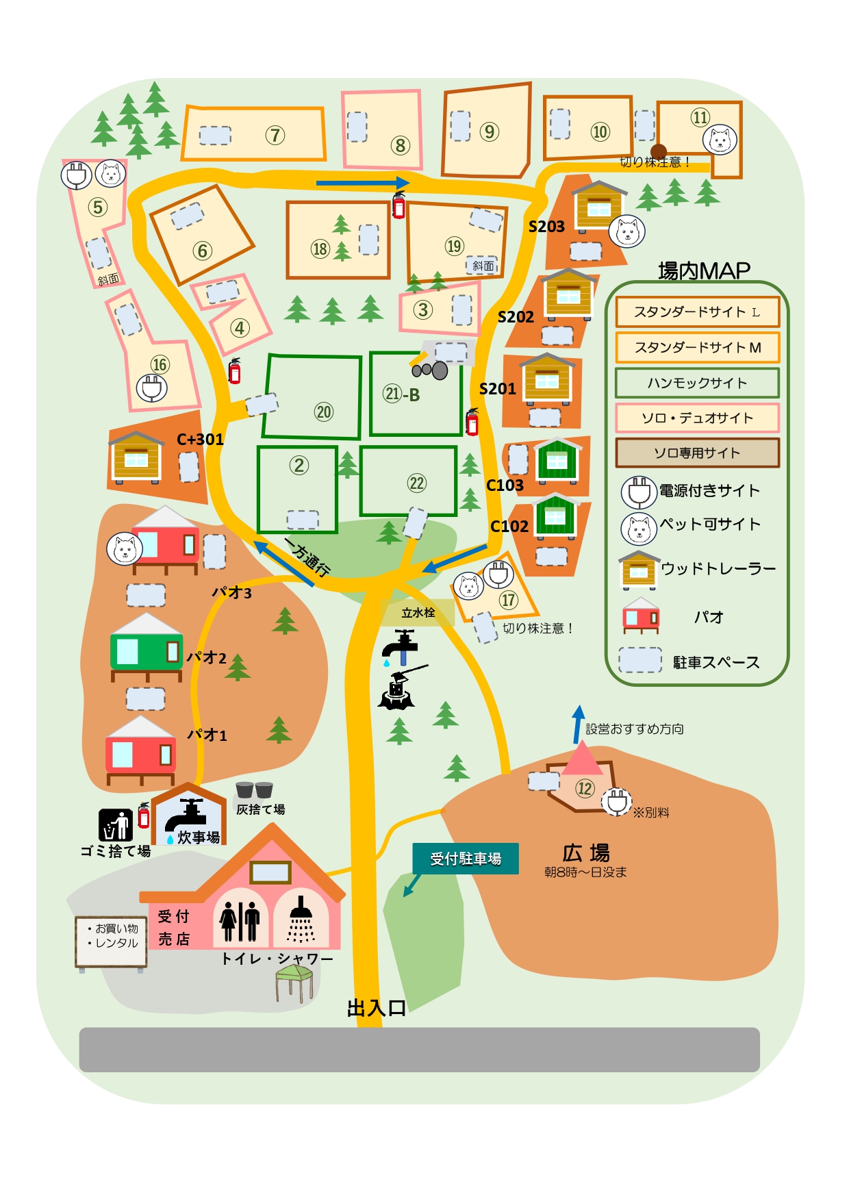 場内案内図2025シーズン 場内案内図2026シーズン 施設案内ウッドトレーラーType-C(コンパクト) ウッドトレーラーType-C+(Cプラス) ウッドトレーラーType-S(スタンダード) デイキャンプ テントサイト パオ 共同スペース 場内案内図 お気軽にお問い合わせください。0555-28-6005受付時間 9:00-17:00 メールでのお問い合わせはこちら