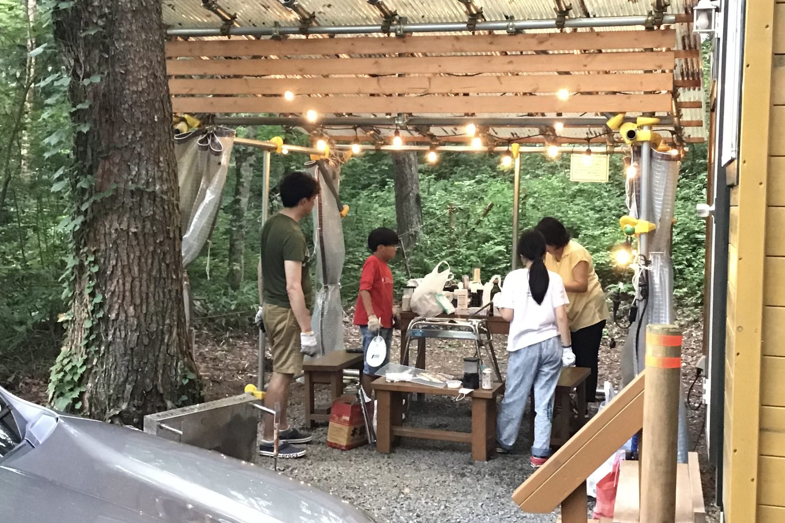 | 屋外スペース | ・パーティーシェード(300)×1 ・木製2人掛ベンチ(80cm×28cm)×3 ・木製テーブル(120cm×62cm)×1 |