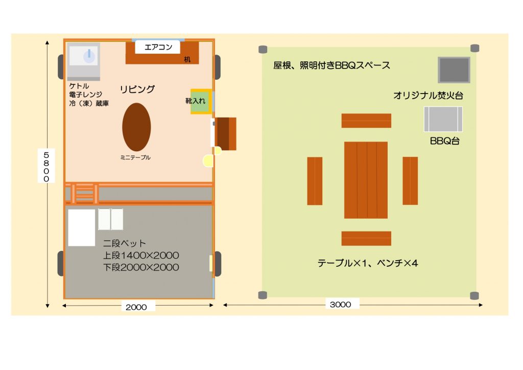 | 屋外スペース | ・パーティーシェード(300)×1 ・木製2人掛ベンチ(80cm×28cm)×3 ・木製テーブル(120cm×62cm)×1 |